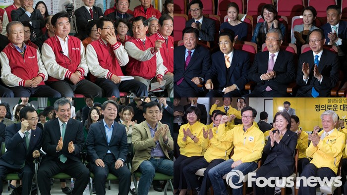 (서울=포커스뉴스) 20대 총선 투표일인 13일 오후 새누리당(왼쪽 위), 더불어민주당(오른쪽 위), 국민의당(왼쪽 아래), 정의당(오른쪽 아래) 지도부가 각각 출구조사 발표 방송을 시청하며 다양한 표정을 짓고 있다.