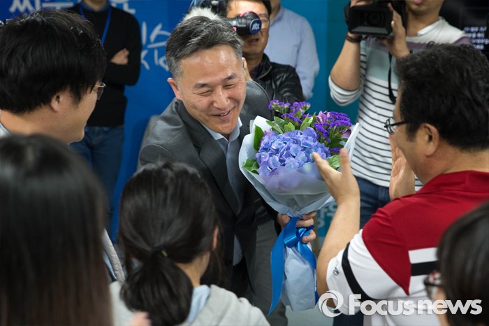 (용인=포커스뉴스) 제20대 국회의원 선거날인 13일 오후 경기도 용인시 기흥에 위치한 선거사무실에서 표창원 더불어민주당 용인정 후보가 '당선유력' 이라는 방송사 개표 상황을 확인하고 지지자들의 축하를 받고 있다.