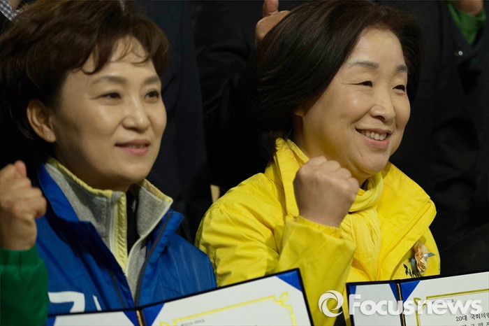 (서울=포커스뉴스) 13일 오후 9시 KBS는 개표율 21.8% 현재 경기 고양정에서 더불어민주당 김현미 후보가 48%를 득표해 당선이 확실하다고 밝혔다.(고양=포커스뉴스) 20대 총선을 일주일 앞둔 6일 오전 고양시 일산동구의 한 교회에서 열린 '100만고양자치연대' 좋은후보 추천식에 참석한 심상정(오른쪽) 정의당 고양시갑 후보와 김현미 더불어민주당 고양시정 후보가 추천서를 들고 기념촬영 하고 있다. 2016.04.06 이승배 기자