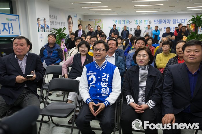 (서울=포커스뉴스) 13일 오후 서울 은평구 강병원 더불어민주당 은평구을 후보의 사무실에서 강후보가 지지자들과 함께 개표방송을 보고 있다.