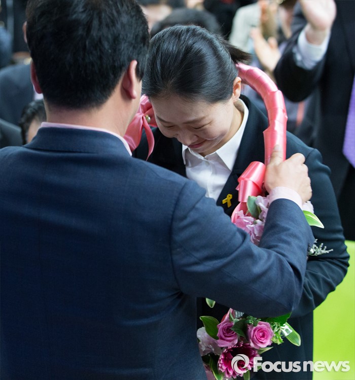 (광주=포커스뉴스) 권은희 국민의당 광주 광산구을 후보가 13일 오후 광주 광산구 수완동 선거사무실에서 당선이 유력해지자 꽃목걸이를 전달 받고 있다.