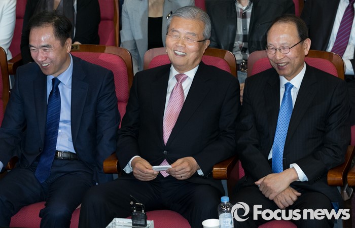 (서울=포커스뉴스) 20대 총선 투표일인 13일 오후 서울 여의도 국회 의원회관 대회의실에 마련된 더불어민주당 개표상황실에서 김종인 비대위 대표 겸 선대위원장과 당직자들이 개표방송을 시청하며 대화하고 있다. 앞줄 왼쪽부터 정장선 총선기획단장, 김 대표, 최운열 국민경제상황실장.