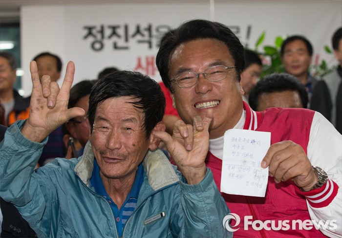 (공주=포커스뉴스) 제20대 충남 공주부여청양 국회의원에 당선된 정진석 새누리당 당선인이 13일 오후 충남 공주 선거사무소에서 지지자와 기념촬영을 하고 있다.