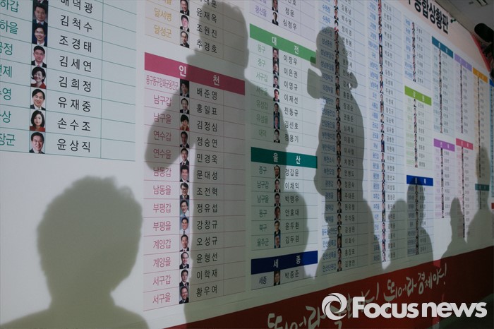 (서울=포커스뉴스) 제20대 국회의원 선거날인 13일 오후 서울 여의도 새누리당사 선거상황실 내 종합상황판 위로, 개표방송을 시청 중인 비례대표 후보들과 당직자들의 그림자가 비춰지고 있다.