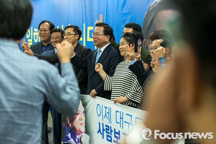 (대구=포커스뉴스) 제20대 국회의원선거 대구 수성구갑 선거구에서 당선이 확실시된 더불어민주당 김부겸 후보가 13일 오후 대구 수성구 선거사무소에서 지지자들과 '이제 대구도 사람보고 뽑는다'는 구호를 외치며 사진촬영을 하고 있다.
