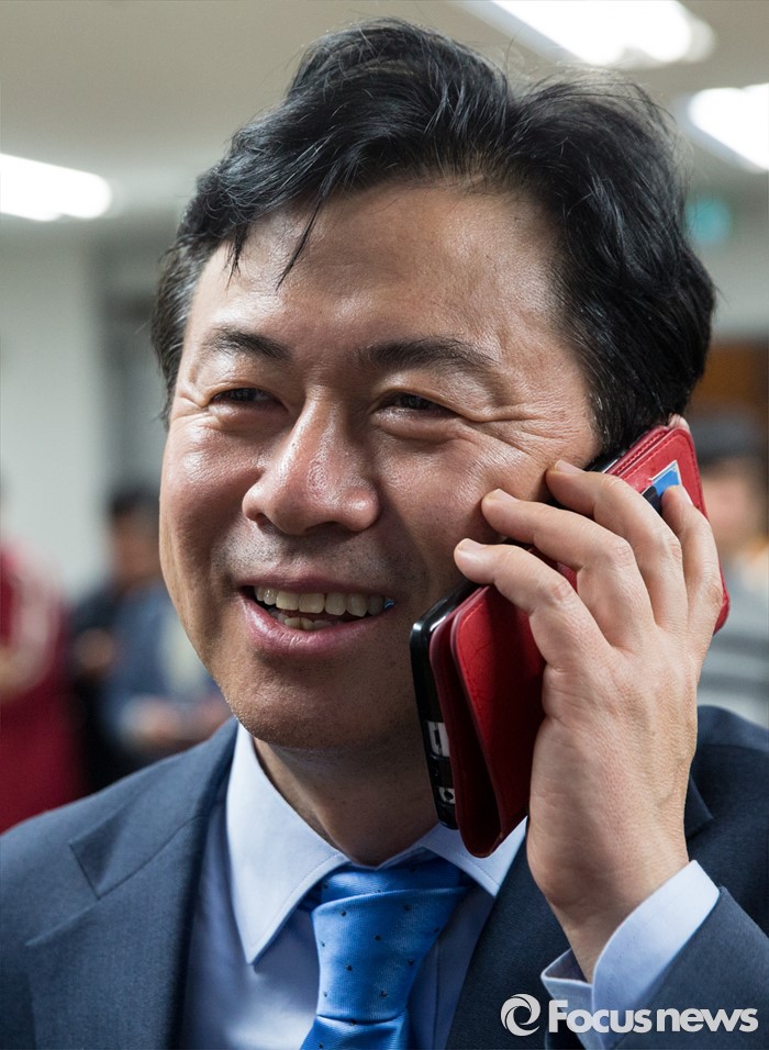 (부산=포커스뉴스) 제20대 국회의원선거에서 당선이 확실시된 전재수 더불어민주당 부산 진구갑 후보가 13일 오후 부산 진구 선거사무소에서 축하전화를 받고 있다.