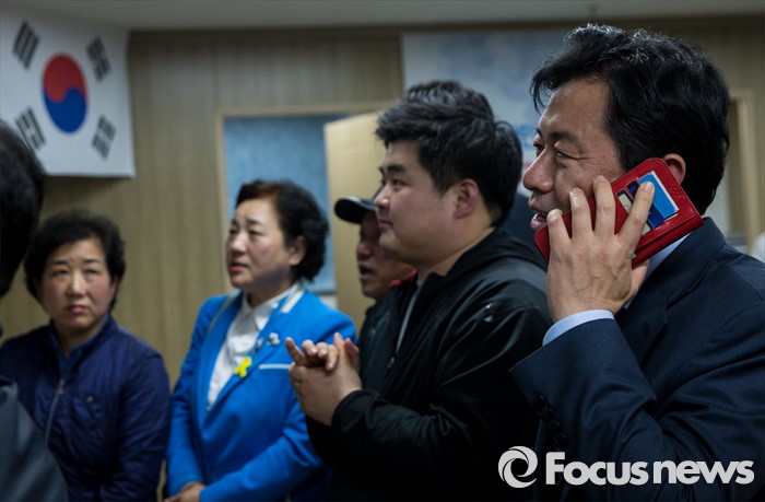 (부산=포커스뉴스) 제20대 국회의원선거에서 당선이 확실시된 전재수 더불어민주당 부산 진구갑 후보가 13일 오후 부산 진구 선거사무소에서 축하전화를 받고 있다.