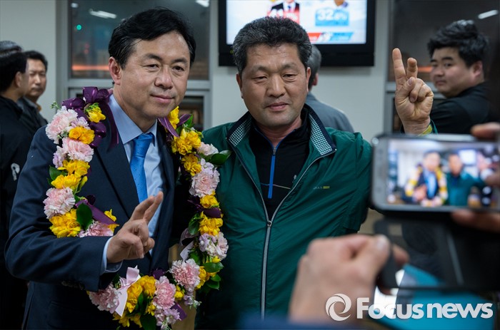 (부산=포커스뉴스) 제20대 국회의원선거에서 당선이 확실시된 전재수 더불어민주당 부산 진구갑 후보가 13일 오후 부산 진구 선거사무소에서 지지자들과 함께 기념사진을 찍고 있다.