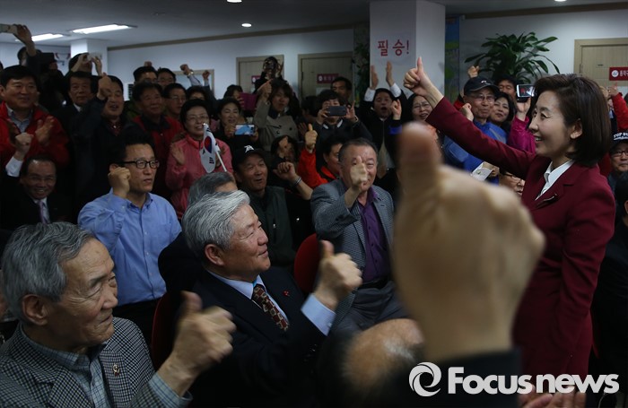 (서울=포커스뉴스) 제20대 국회의원 선거날인 13일 오후 서울 동작구에 위치한 선거사무실에서 나경원 새누리당 동작구을 후보가 지지자들에게 축하를 받고 있다.
