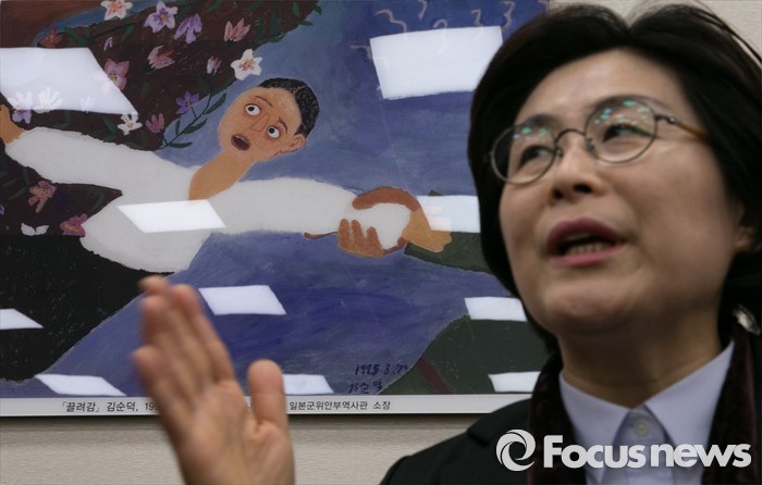 △1960 서울 △예일여고·이화여대 문리대, 동대학원 석사·한양대 행정학 박사 △전 더불어민주당 최고위원·현 국회 여성가족위원장 등(서울=포커스뉴스) 5일 오전 서울 여의도 국회에서 여성가족위원회 전체회의가 산회된 후 취재진 질문에 답변하는 유승희 위원장 뒤로 故 김순덕 위안부 피해 할머니 유작 '끌려감'이 보이고 있다. 이날 여가위는 한일 위안부 합의와 관련 여성가족부의 현안보고를 들으려 했으나, 여야 간사간 협의가 이루어지지 않은 점을 들어 여당 의원과 김희정 장관은 참석하지 않았다. 2016.01.05 박동욱 기자