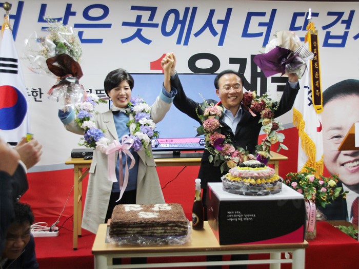 (서울=포커스뉴스) 제20대 국회의원선거일인 13일 윤재옥 새누리당 대구 달서구을 후보가 당선이 확실시 되자 자신의 사무소에서 세리머니를 하고 있다. <사진제공= 윤재옥 후보 선거사무소>
