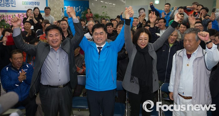 (논산=포커스뉴스) 제20대 충남 논산계룡금산 국회의원에 당선된 김종민 더불어민주당 당선인이 14일 논산 선거사무실에서 환호하고 있다.