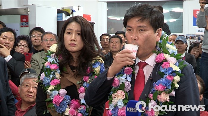 (서울=포커스뉴스) 20대 총선에서 당선이 확정된 지상욱 새누리당 중구성동을 후보가 14일 중구 신당동 선거사무소에서 당선 소감을 전하고 있다. 왼쪽은 부인 심은하 씨. <사진=포커스뉴스 영상캡쳐>