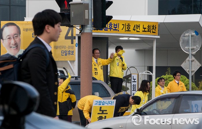 (창원=포커스뉴스) 제20대 국회의원선거 경남 창원 성산구 국회의원에 당선된 노회찬 정의당 당선인이 14일 오전 창원시 위아사거리에서 출근길 시민들에게 당선인사를 하고 있다.