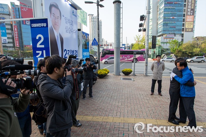 (대구=포커스뉴스) 제20대 국회의원선거 대구 수성구갑 선거구에서 당선된 더불어민주당 김부겸 당선자가 14일 오전 대구 수성구 범어네거리에 도착해 당선인사에 앞서 선거캠프 관계자와 포옹하고 있다.