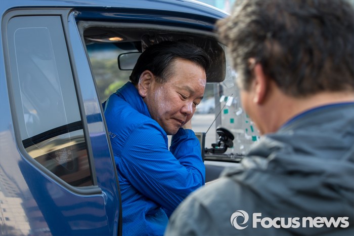 (대구=포커스뉴스) 제20대 국회의원선거 대구 수성구갑 선거구에서 당선된 더불어민주당 김부겸 당선자가 14일 오전 대구 수성구 범어네거리에서 당선 인사를 하고 있다.