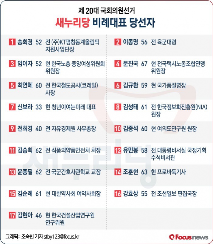이밖에 비례 후보 당선자에는 11번 김승희(여·62) 전 식품의약품안전처 처장이, 12번유민봉(58) 전 청와대 국정기획수석, 윤종필(62·여) 전 국군간호사관학교 교장, 프로 바둑기사 조훈현(63) 9단이 자리했다.