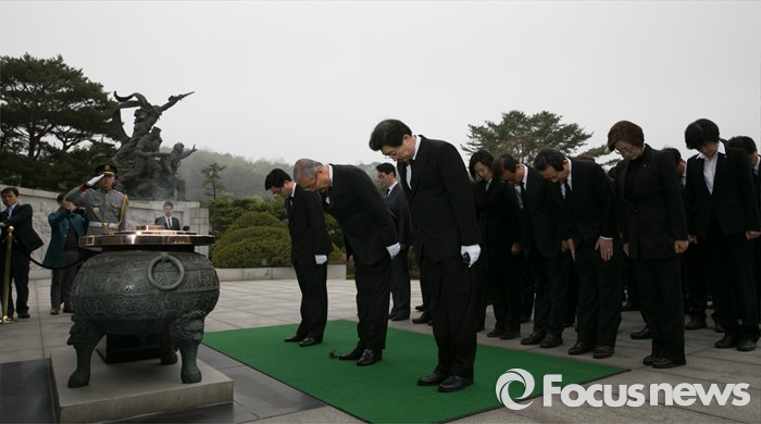 (서울=포커스뉴스) 14일 오전 동작구 국립서울현충원에서 김종인 더불어민주당 비대위 대표와 20대 총선 당선인들이 현충탑 참배를 하고 있다.