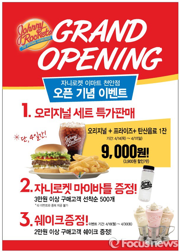 또한 자니로켓 천안점은 14일부터 나흘간 오리지널 햄버거와 프라이즈, 탄산음료 1잔으로 구성한 오리지널 세트를 30% 할인가인 9000원에 판매한다. 18일부터 30일까지 2만원 이상 구매자에게는 오리지널 쉐이크를, 3만원 이상은 자니로켓 로고가 새겨진 마이보틀 병 500개를 선착순으로 증정한다.