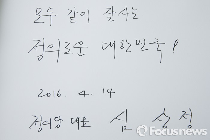 (서울=포커스뉴스) 심상정 정의당 상임대표와 20대 총선 비례대표 당선인들이 14일 오전 동작구 국립서울현충원에서 현충탑 참배를 했다. 사진은 심 대표가 남긴 방명록.