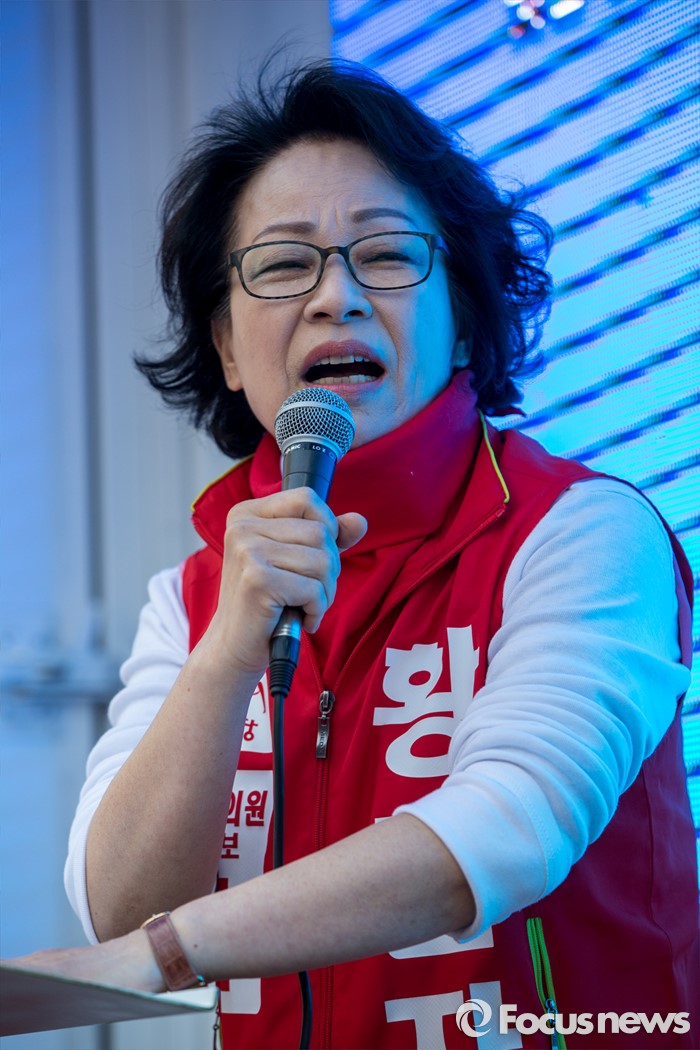 지난 13일 치러진 제20대 국회의원 총선거에서 같은 지역구에 출마한 진영 더불어민주당 후보가 42.8%의 지지율로 황 후보(39.9%)를 제치고 당선됐다.황춘자 새누리당 용산구 후보가 5일 오후 서울 용산구 이태원동 일대에서 유세를하며 주민들에게 한 표를 호소 하고 있다. 2016.04.05 강진형 기자