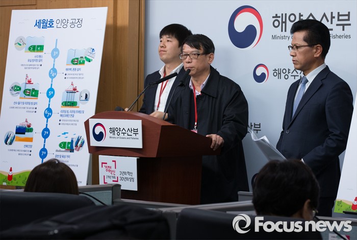 (세종=포커스뉴스) 왕웨이핑 세월호 인양 현장 총감독이 14일 오전 세종시 정부세종청사 해양수산부 기자실에서 세월호 인양 작업에 대해 설명하고 있다.