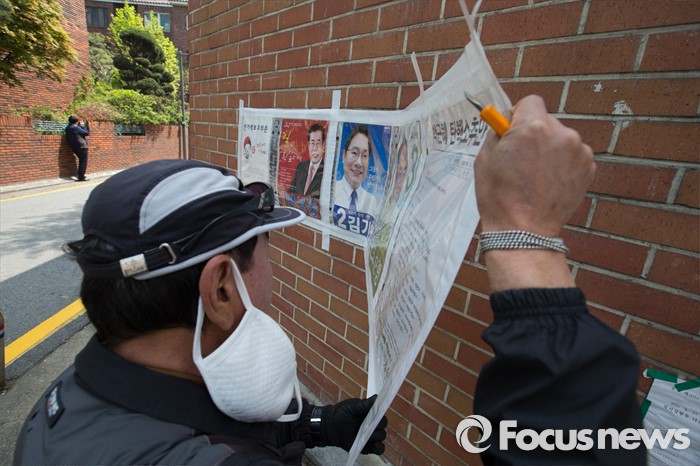 (서울=포커스뉴스) 제20대 국회의원 선거가 끝난 14일 오후 서울 서초구 일대에서 서초3동 주민센터 직원이 벽보를 철거하고 있다.