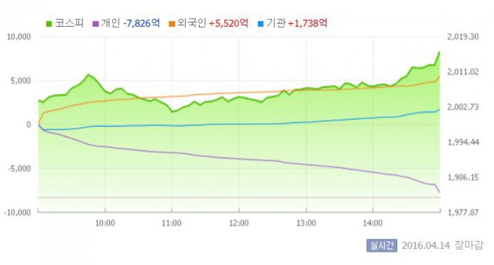 14일 코스피지수는 전거래일 대비 1.75%(34.61포인트) 오른 2015.93에 장을 마쳤다. 이는 연중 최고치이자 지난해 12월 1일(2023.93) 이후 가장 높은 수준이다.