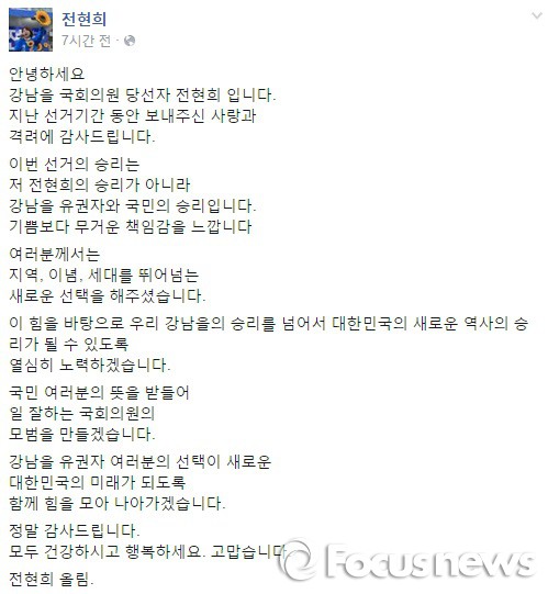 전 당선인은 "선거기간 동안 보내주신 사랑과 격려에 감사드린다"며 "이번 선거의 승리는 전현희의 승리가 아니라 강남을 유권자와 국민의 승리"라고 말했다.