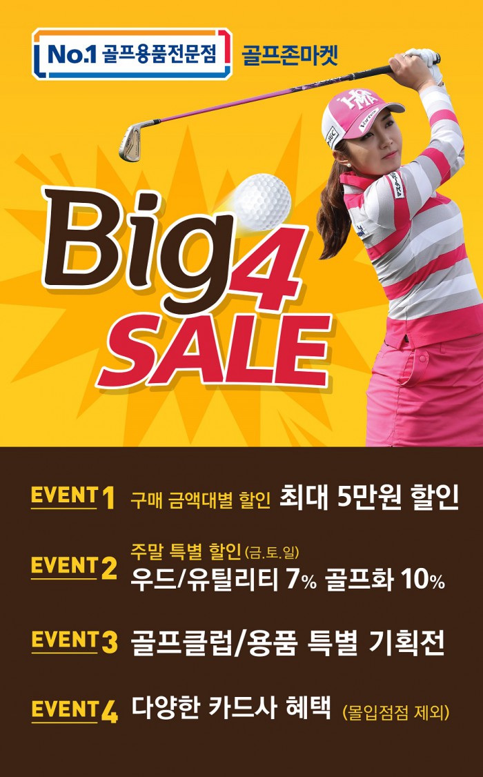이 외에도 삼성카드 사용자가 2016년 미즈노 아이언 세트를 구매하면 3만원 캐시백, 2만원 추가 할인과 함께 항공커버도 준다. KB카드 사용자가 5만원 이상 결제하면 최대 5개월 무이자 혜택과 100만원 이상 결제 시 3만원 캐시백이 제공된다.'빅4 세일' 이벤트를 알리는 포스터.<사진제공=골프존>