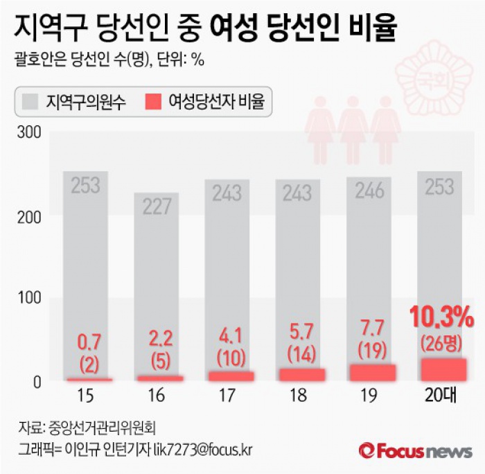 (서울=포커스뉴스) 이번 20대 국회의원 선거에서 여성 당선인은 총 26명으로, 전체 지역구 당선인(253명)의 10.27%를 차지했다.
