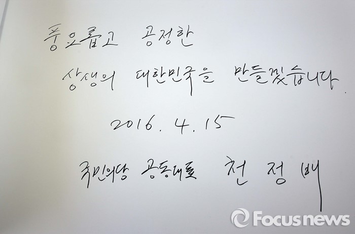 (서울=포커스뉴스) 안철수, 천정배 국민의당 상임공동대표와 20대 총선 당선인들이 15일 오전 동작구 국립서울현충원에서 현충탑 참배를 했다. 사진은 천 대표가 남긴 방명록.