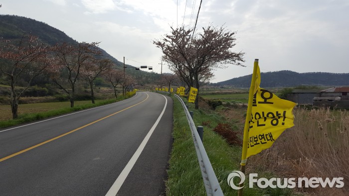 팽목항이 가까워질수록 노란 유채꽃은 '세월호 온전한 인양!'이라고 적힌 노란 현수막으로 바뀌었다.