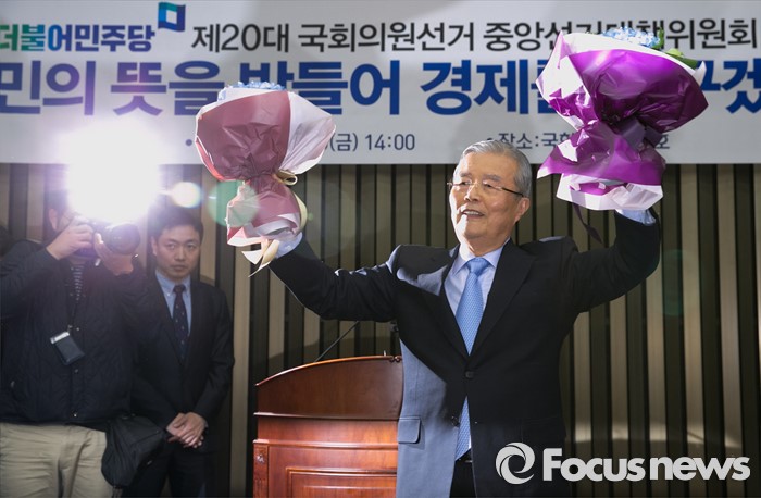 (서울=포커스뉴스) 김종인 더불어민주당 비대위 대표 겸 선대위원장이 15일 오후 서울 여의도 국회에서 열린 20대 총선 중앙선대위 해단식에 참석해 당직자로부터 받은 꽃다발을 들고 포즈를 취하고 있다.