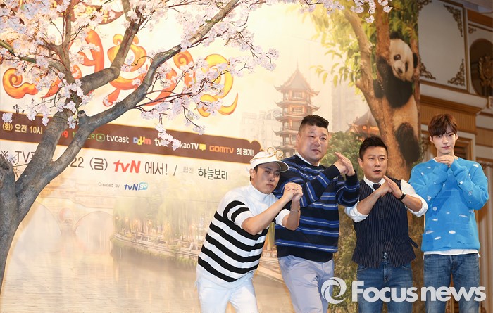 (서울=포커스뉴스) 15일 오후 서울 강남구 임피리얼 팰리스 호텔에서 열린 tvN go '신서유기2' 제작발표회에 참석한 출연진이 포토타임을 갖고 있다. 왼쪽부터 은지원, 강호동, 이수근, 안재현.
