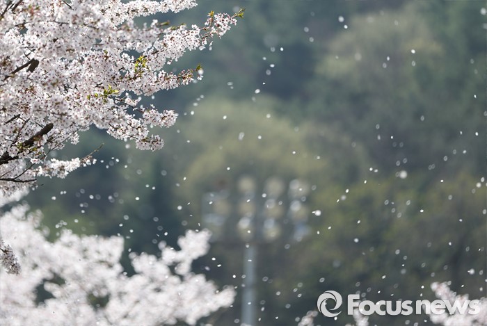 (서울=포커스뉴스) 15일 경기 용인시 명지대학교 자연캠퍼스에서 벚꽃잎이 바람에 흩날리고 있다. <사진제공=명지대학교>