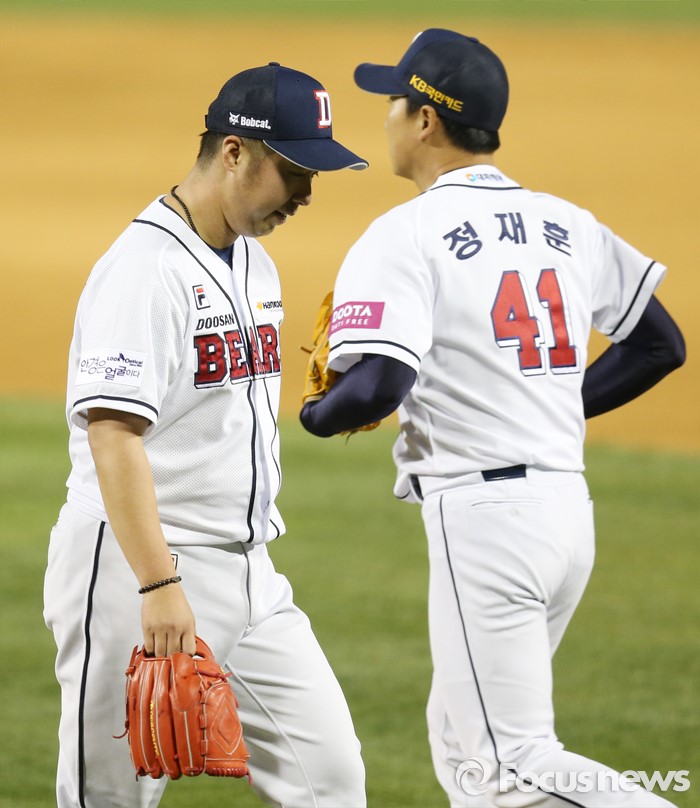 (서울=포커스뉴스) 15일 서울 잠실구장에서 열린 2016 프로야구 삼성-두산 경기 7회초 2사 만루에서 두산 선발투수 유희관이 마운드에서 내려오고 정재훈이 교체 투입되고 있다.