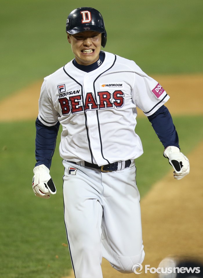 (서울=포커스뉴스) 15일 서울 잠실구장에서 열린 2016 프로야구 삼성-두산 경기 8회말 2사 1루에서 두산 대타 최주환이 우익수를 넘기는 2루타때 1루주자 민병헌이 홈인하고 있다.