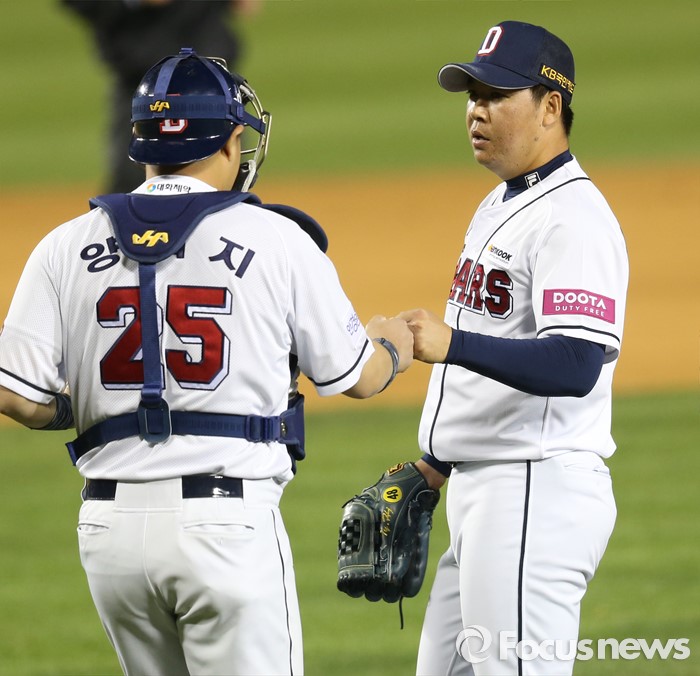 (서울=포커스뉴스) 15일 서울 잠실구장에서 열린 2016 프로야구 삼성-두산 경기에서 삼성에 7-2로 승리한 두산의 마무리 투수 이현승과 포수 양의지가 주먹을 마주치고 있다.