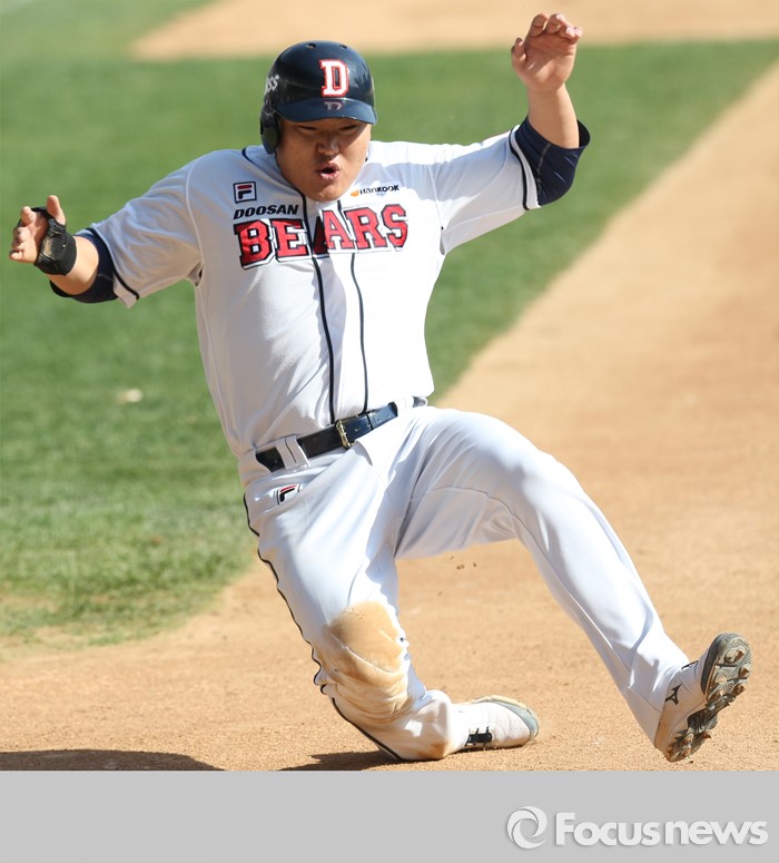 (서울=포커스뉴스) 17일 서울 잠실구장에서 열린 2016 프로야구 삼성-두산 경기 6회말 2사 1,2루에서 두산 정수빈의 우전안타때 2루주자 오재일이 홈까지 달려 세이프되고 있다.