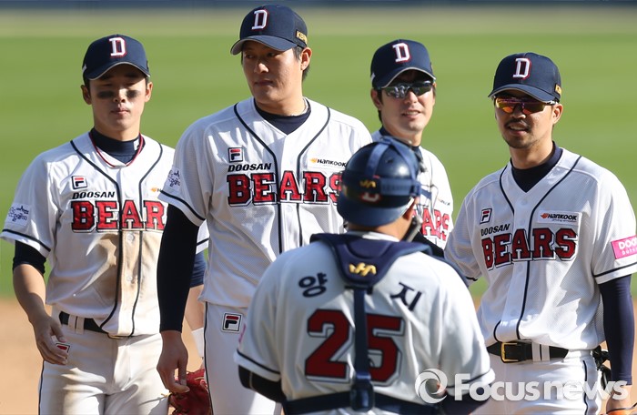 (서울=포커스뉴스) 17일 서울 잠실구장에서 열린 2016 프로야구 삼성-두산 경기에서 삼성을 6-2로 물리친 두산 선수들이 마운드에 모여 승리의 기쁨을 나누고 있다. 두산은 5연승을 하며 선두를 지켰다.