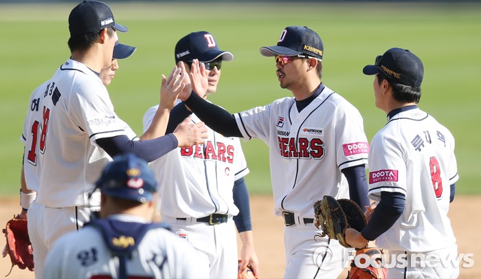 (서울=포커스뉴스) 17일 서울 잠실구장에서 열린 2016 프로야구 삼성-두산 경기에서 삼성을 6-2로 물리친 두산 선수들이 마운드에 모여 하이파이브하며 승리의 기쁨을 나누고 있다. 두산은 5연승을 하며 선두를 지켰다.