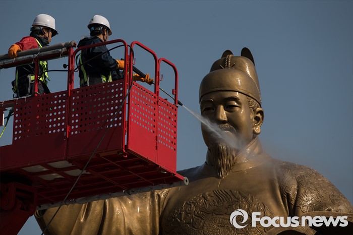 (서울=포커스뉴스) 18일 오전 서울 세종로사거리 광화문광장에서 서울시 관계자들이 세종대왕 동상 세척작업을 하고 있다.