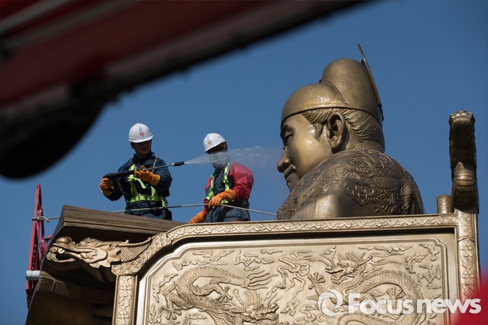 (서울=포커스뉴스) 18일 오전 서울 세종로사거리 광화문광장에서 서울시 관계자들이 세종대왕 동상 세척작업을 하고 있다.