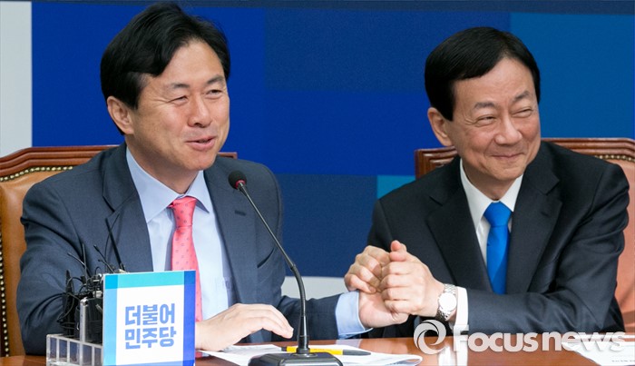 (서울=포커스뉴스) 김영춘(왼쪽) 더불어민주당 비대위원이 18일 오전 서울 여의도 국회에서 열린 비상대책위원회의에 참석해 발언 중 진영 비대위원과 함께 일하게 되어 반갑다며 손을 잡고 있다.