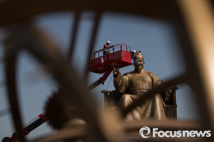 (서울=포커스뉴스) 18일 오전 서울 세종로사거리 광화문광장에서 서울시 관계자들이 세종대왕 동상 세척 및 보존 작업을 하고 있다.