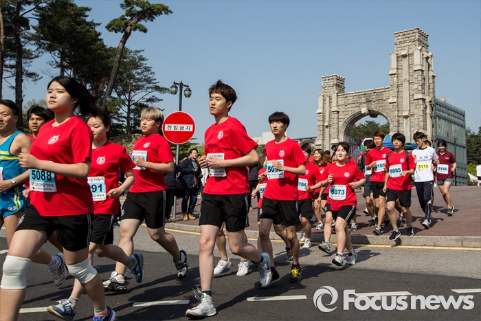 (서울=포커스뉴스) 4·19 혁명 56주기를 하루 앞둔 18일 오전 서울 성북구 고려대학교에서 열린 '4·18 희망나눔 마라톤'에 참가한 고려대생 및 일반인 참가자들이 힘차게 출발하고 있다.