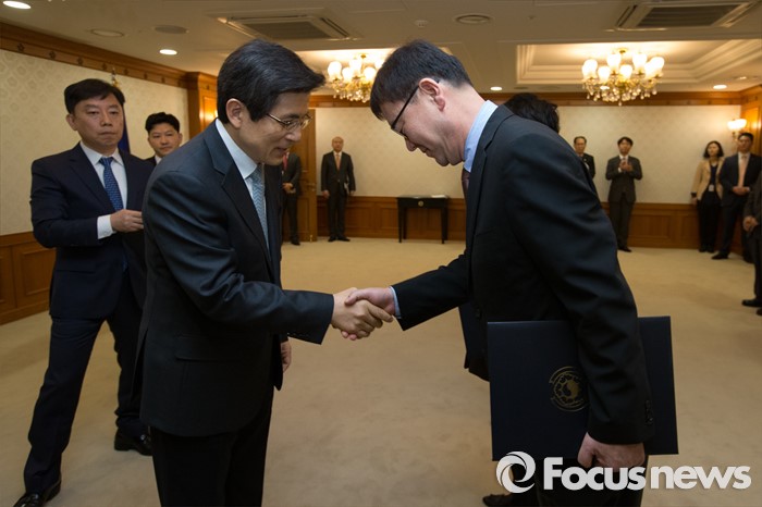 (서울=포커스뉴스) 황교안 국무총리가 18일 오전 서울 종로구 정부서울청사에서 민간위원에게 도시재생특별위 위촉장을 수여하고 있다.