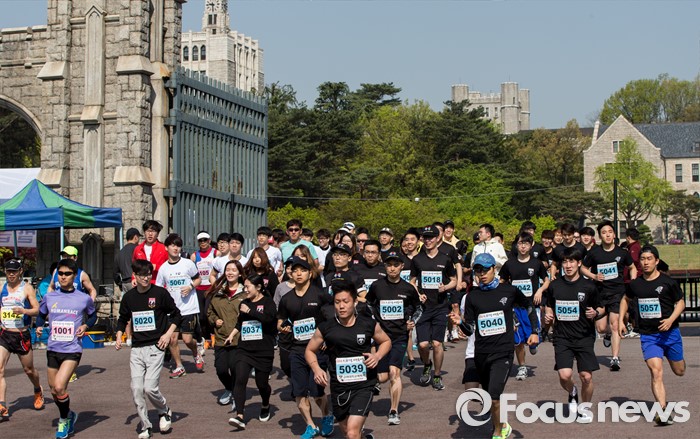 (서울=포커스뉴스) 4·19 혁명 56주기를 하루 앞둔 18일 오전 서울 성북구 고려대학교에서 열린 '4·18 희망나눔 마라톤'에 참가한 고려대생 및 일반인 참가자들이 힘차게 출발하고 있다.