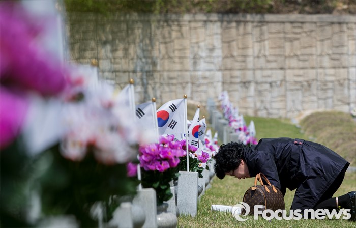(서울=포커스뉴스) 4·19 혁명 56주기를 하루 앞둔 18일 오전 서울 강북구 국립4.19 민주묘지에서 희생자의 유가족이 절하고 있다.